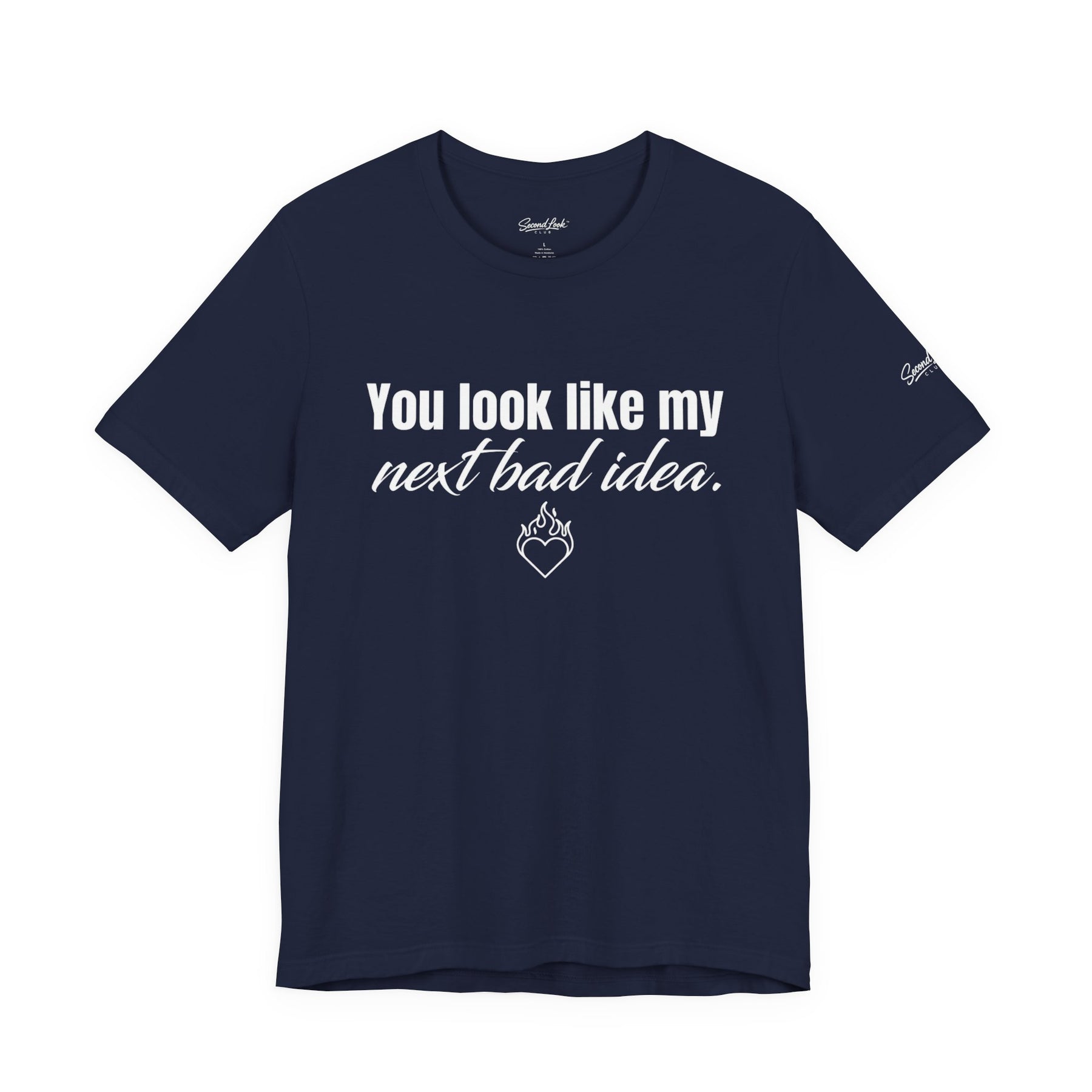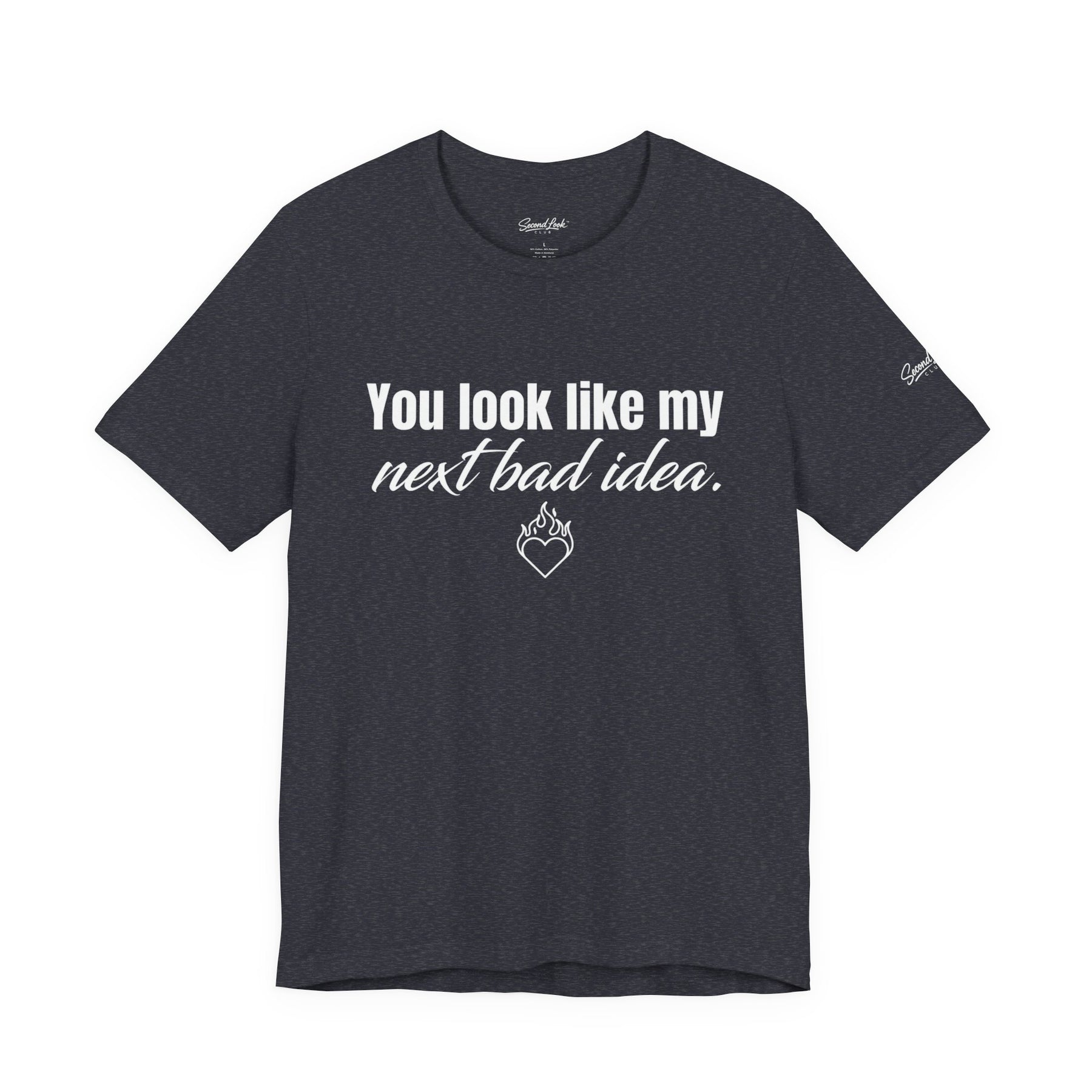 Embrace the thrill of a little trouble with this edgy flirty graphic tee. Featuring the witty and unapologetic slogan, "You look like my next bad idea," this shirt is perfect for anyone who loves a bit of dark humor and romantic spontaneity. The design stands out with a striking white print against a classic black backdrop, utilizing a clean sans-serif font for the first line and a sharp, italicized script for the punchline. A minimalist flaming heart icon sits centered below the text, adding a touch of rebellious aesthetic to this modern statement piece.